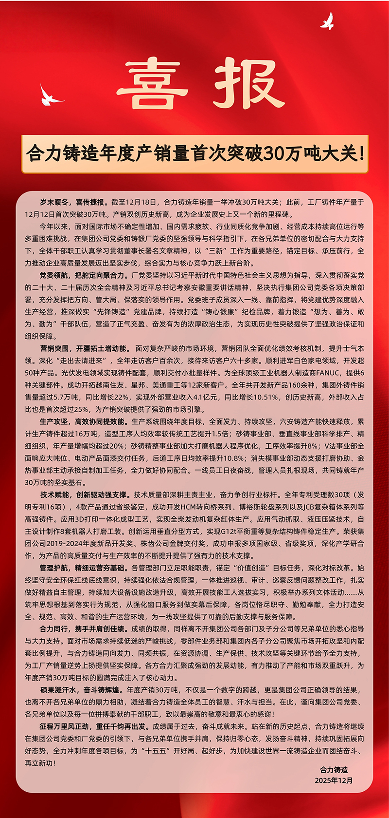 安徽合力股份有限公司合肥鑄鍛廠是安徽合力股份有限公司的核心企業(yè)之一,是中國鑄協(xié)副會長單位、安徽省鑄協(xié)會長單位、全國消失模與V法協(xié)會及學會副理事長單位、華東鑄協(xié)常務(wù)理事單位,系中國綠色鑄造示范企業(yè)、中國鑄造行業(yè)綜合百強企業(yè)、全國鑄鐵行業(yè)及安徽省鑄造行業(yè)排頭兵、中國鑄造行業(yè)教育培訓基地。2015年企業(yè)成立了“國家開放大學鑄造學院學習中心”。
